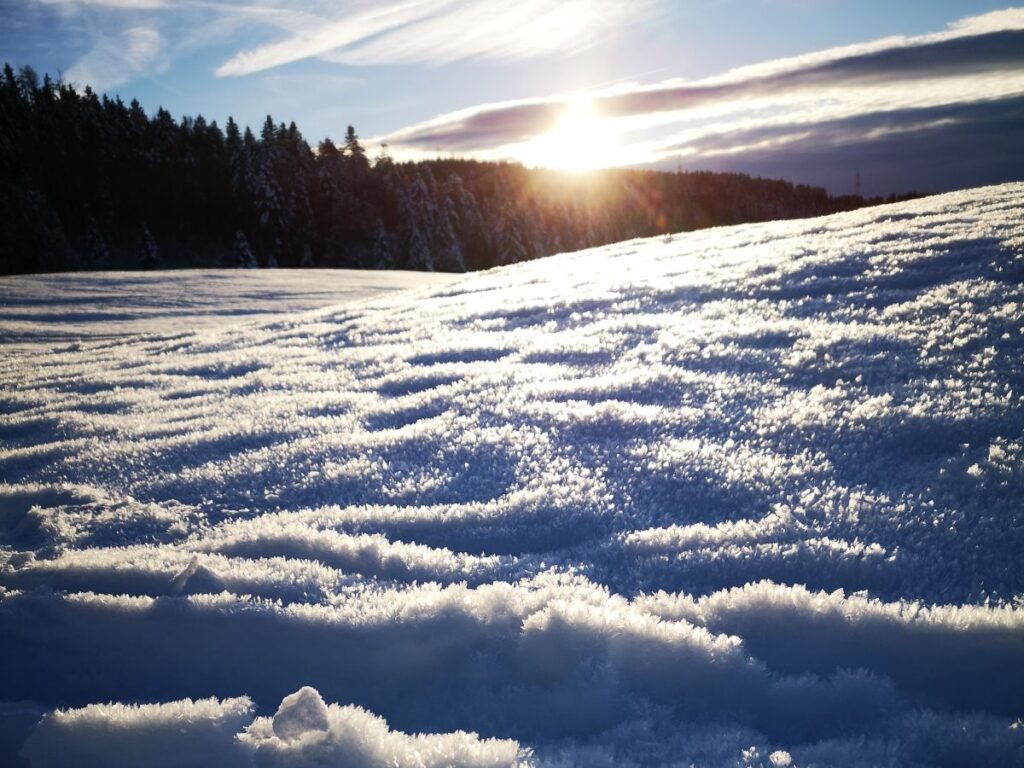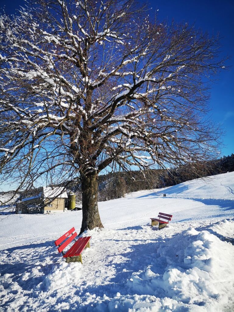 Leider sind die Tage im Winter recht kurz, deshalb verweilen wir nicht sehr lange und machen uns auf den Rückweg. Wir wählen den Weg der zunächst entlang der Straße talwärts führt, achten auf den Wegweiser der rechts in den Wald führt. Bei unserem Besuch ist dieser im Schnee gut ausgetreten. Es geht etwas steiler bergab. Der Weg führt über den Kohlplatz nach Schachen/ Zwieseln. Wir bleiben auf dieser Straße und wandern gemütlich zurück zum Bahnhof Gais, wo wir unser Auto stehen haben.