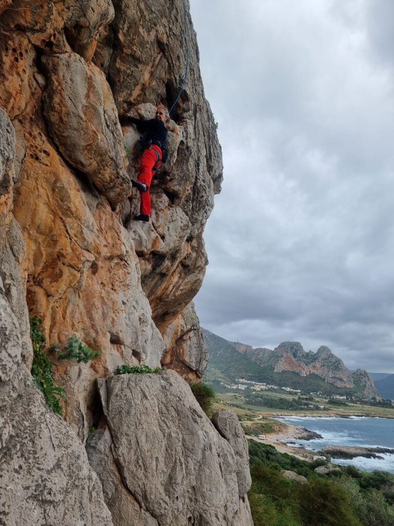 Mit einer Flugreise ging es im Februar weiter. Schon seit längerem haben wir einen Klettertrip nach Sizilien geplant. Es ist schon viele Jahre her, dass wir dort waren. Das wollten wir ändern. Deshalb ging es für 2 Freunde und uns nach Sizilien – genauer gesagt nach San Vito lo Capo. Hier erwartete uns ein 5 Kilometer langes Felsband mit einer gewaltigen Anzahl an Klettertouren, viele davon neu erreichtet. Februar ist eine gute Zeit um hier zu klettern. Wir hatten grandioses Wetter und ganz viel Glück, denn ich durfte Delphine in freier Wildbahn beobachten. Ein großer Traum ging in Erfüllung.